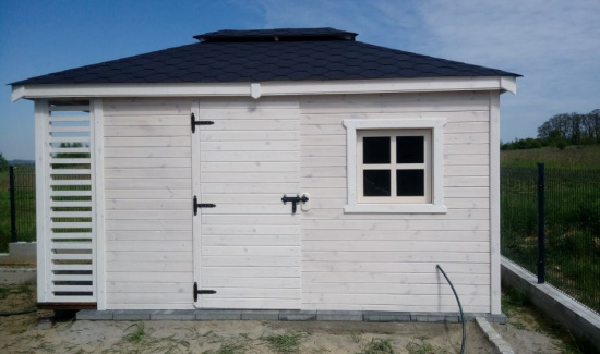 Jedną z naszych propozycji jest konstrukcja, łącząca w sobie domek i drewutnię. Idealny na działkę lub jako domek narzęciowy lub mała pracownia:
